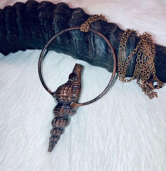 Real Spiral Seashell Pendant Electroformed in Copper with Garnet Gemstone