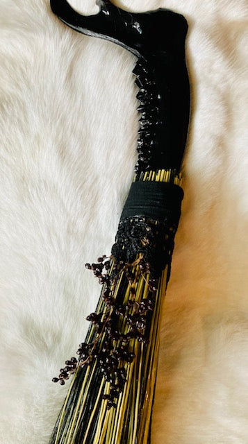 A large, hand crafted altar broom/besom. Hand dyed and hand tied authentic broom corn. Leather, lace and suede ties, broomcorn flower embellishments, and a real White tailed deer jaw bone handle. This particular broom has natural and black bristles and measures approx. 20" in length.