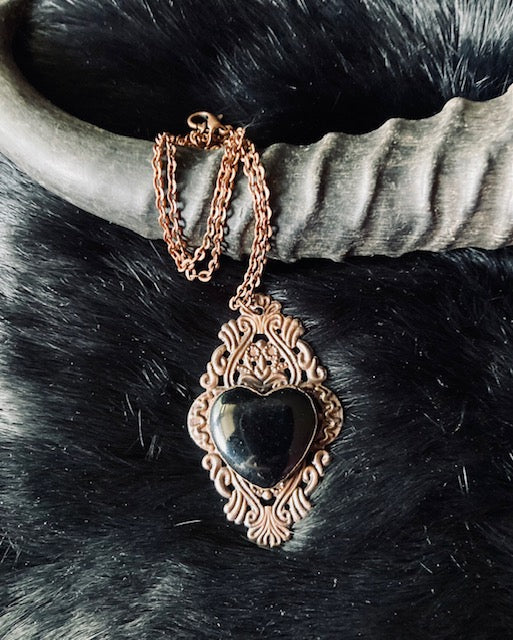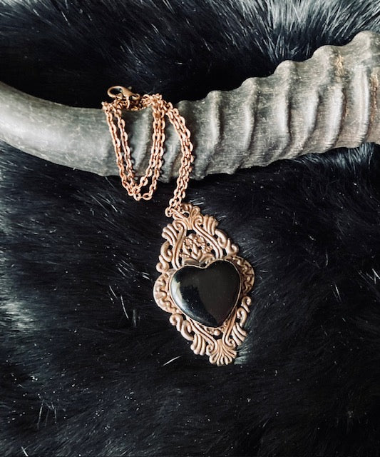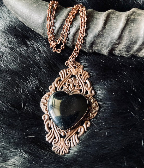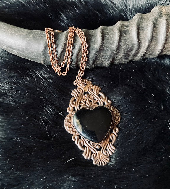 Victorian style copper, electroformed pendant with a Black Obsidian gemstone heart.
