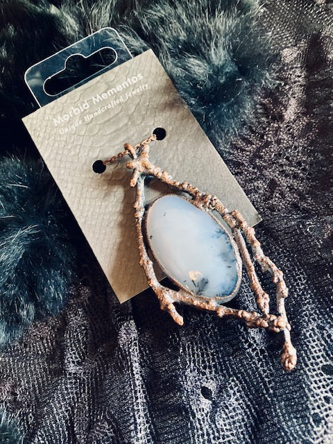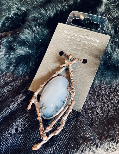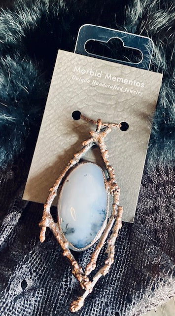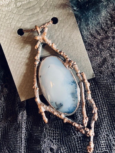 Gorgeous natural sticks electroformed in copper with a big Dendritic Agate gemstone on a copper chain approx. 18-20" in length.
