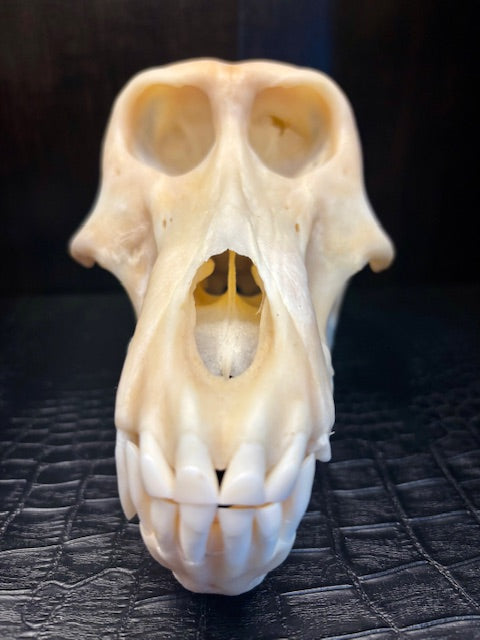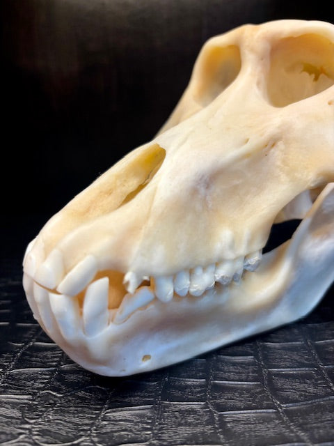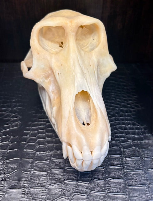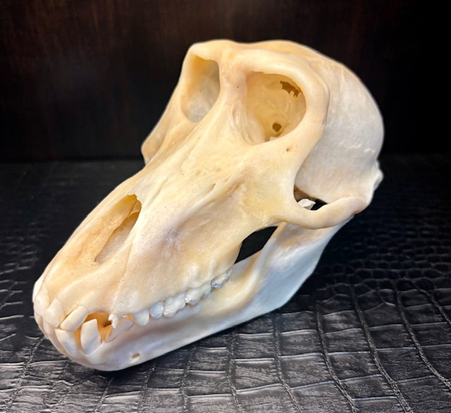 This authentic adult female Papio ursinus (Chacma baboon) skull is a striking specimen, ideal for collectors of natural history and osteological study. The skull shows minor damage to one eye socket and a single tooth, but remains in overall excellent condition, displaying the distinctive features of this powerful primate species.