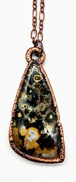 Beautiful piece of Ocean Jasper encased in copper and hanging from a copper chain. Pendant may vary slightly from the picture but will be very similar. Approx 2".