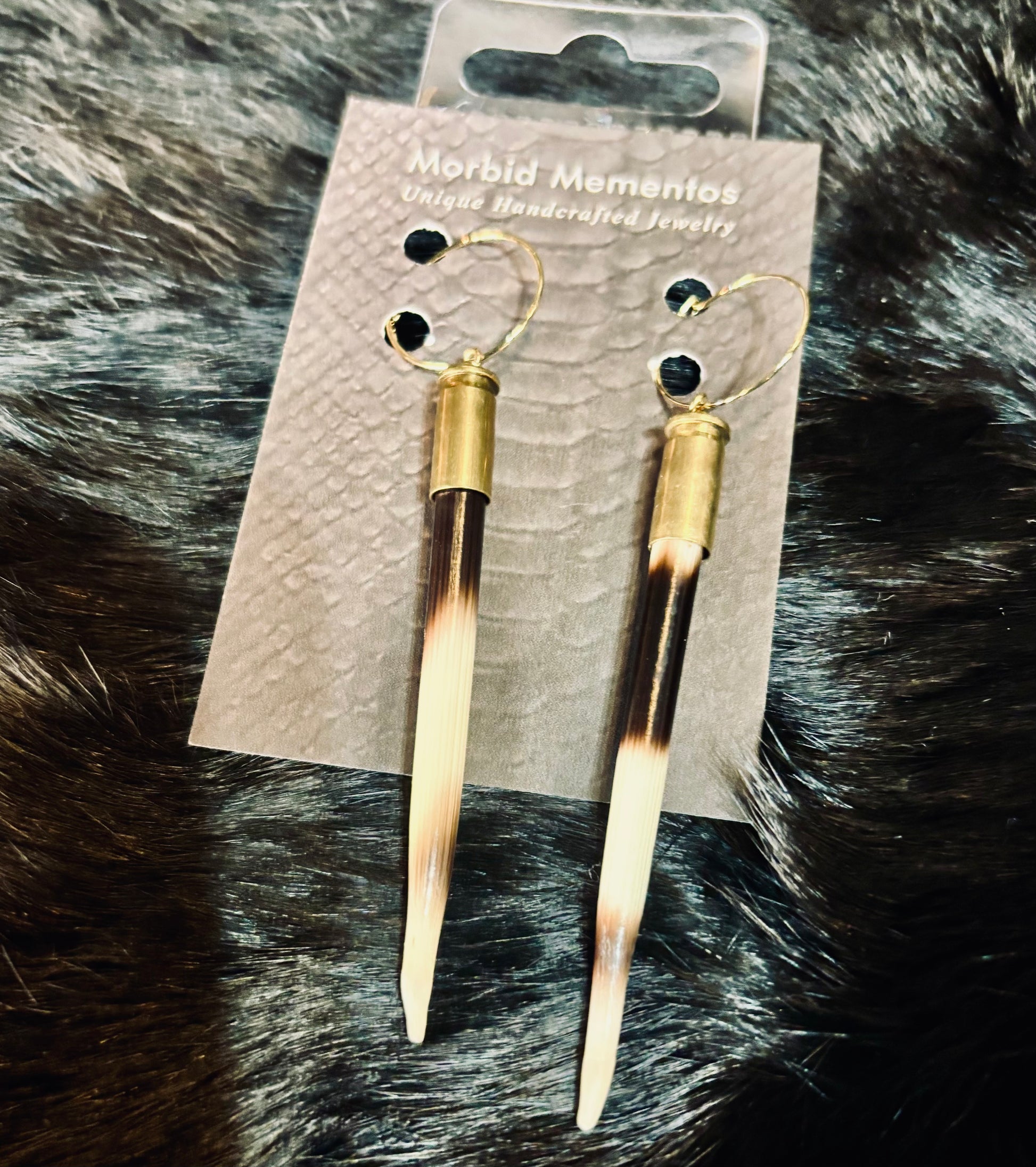 These striking earrings pair natural porcupine quills with brass bullet casings for a bold, earthy statement piece. The hoops are gold-plated stainless steel, offering durability and a touch of polished shine. Each quill has been carefully filed at the tip to ensure they’re not dangerously sharp, while still maintaining their dramatic look.