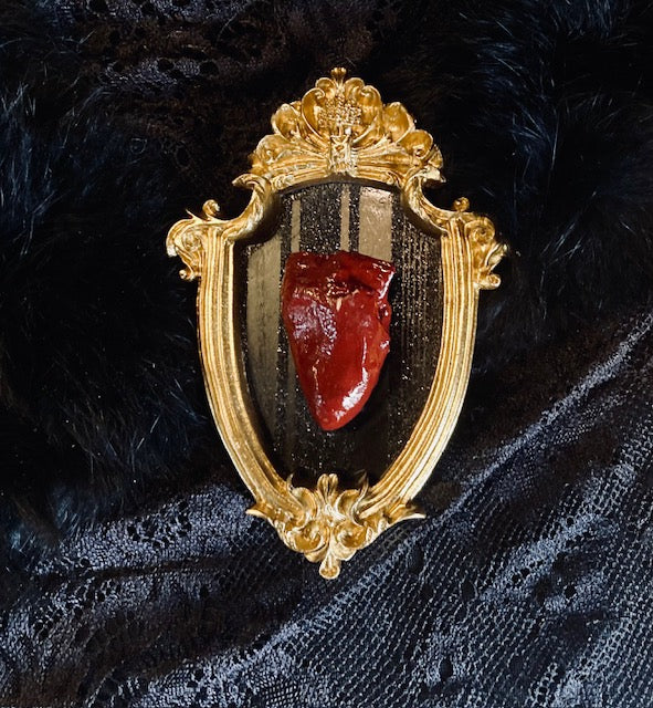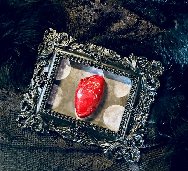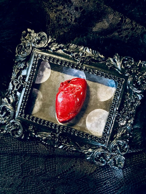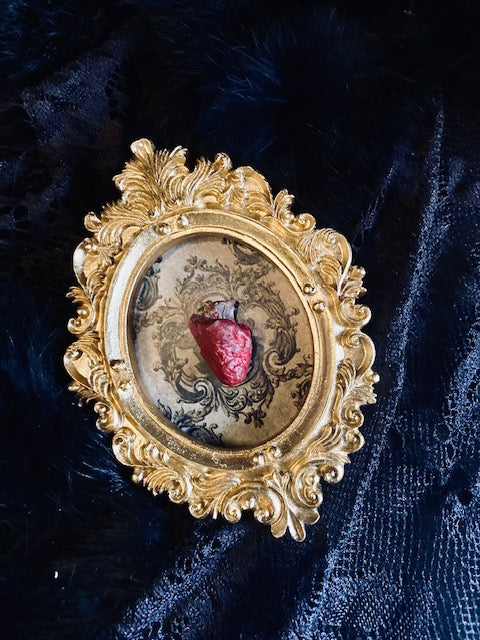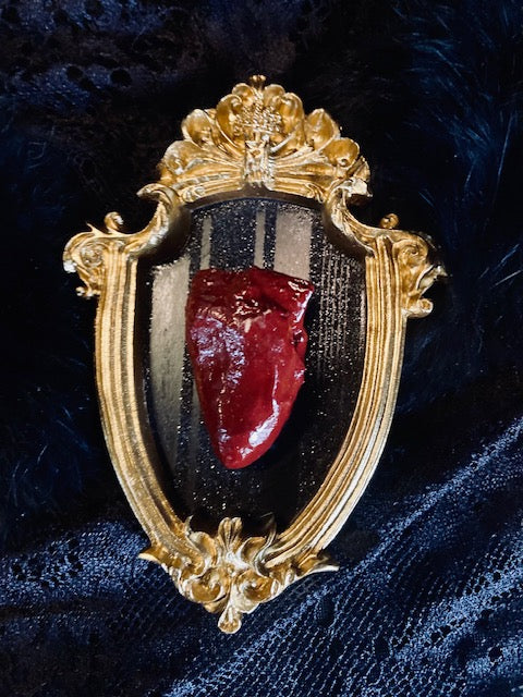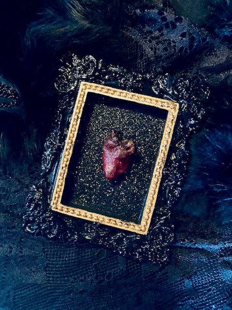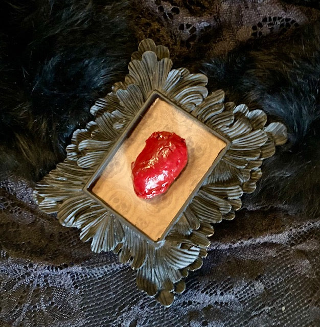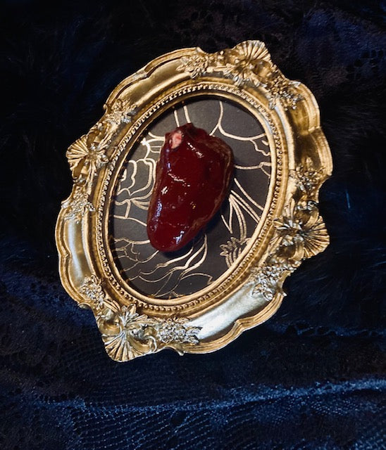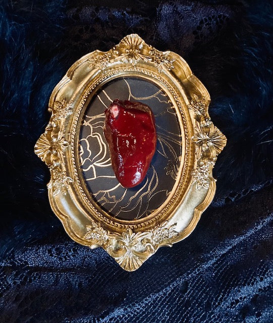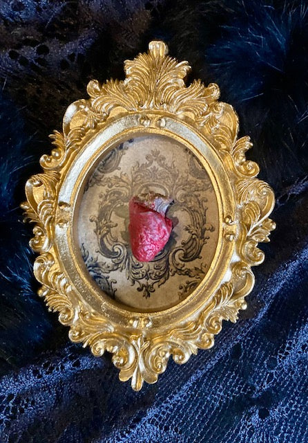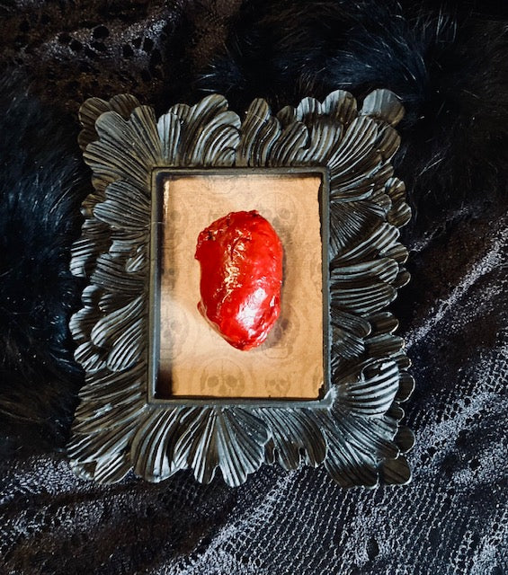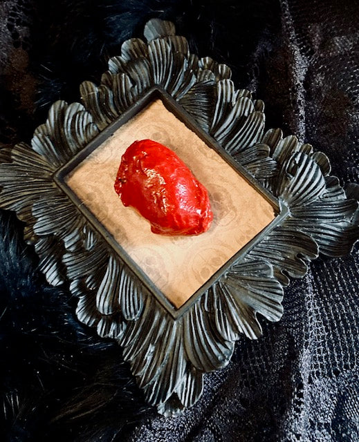 Real Mummified Bird Hearts mounted in ornate frames. All frames have hardware attached for easy wall hanging. Sizes vary slightly but all are approx. 4"x3". Be sure to choose your option at checkout.