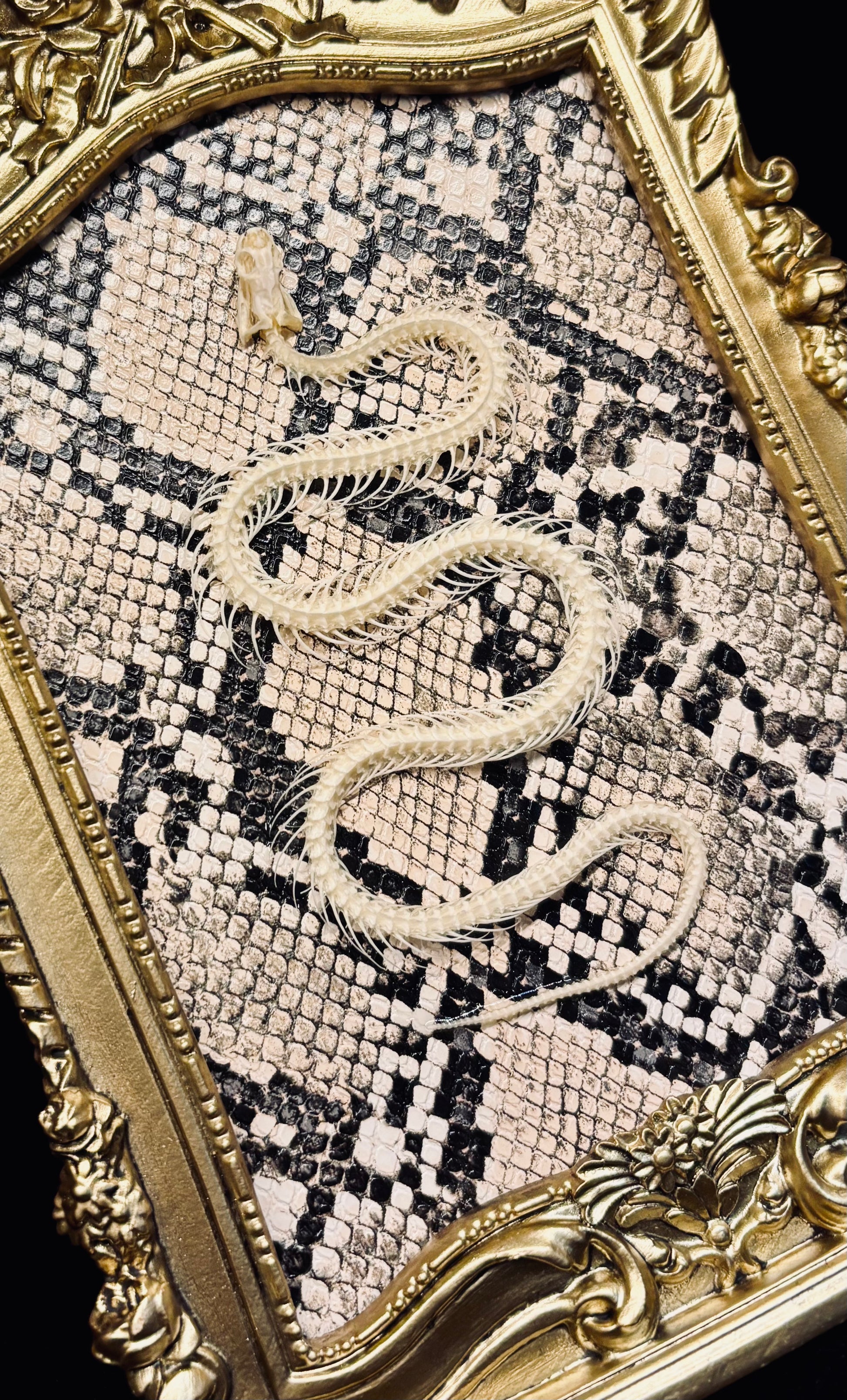 A genuine pit viper skeleton artfully mounted on faux snakeskin leather within an ornate gold frame. The composition highlights the serpent’s delicate bone structure against a richly textured backdrop, creating a striking balance of natural form and refined presentation. A captivating display piece for collectors of zoological art and natural curiosities. Ethically and responsibly sourced.