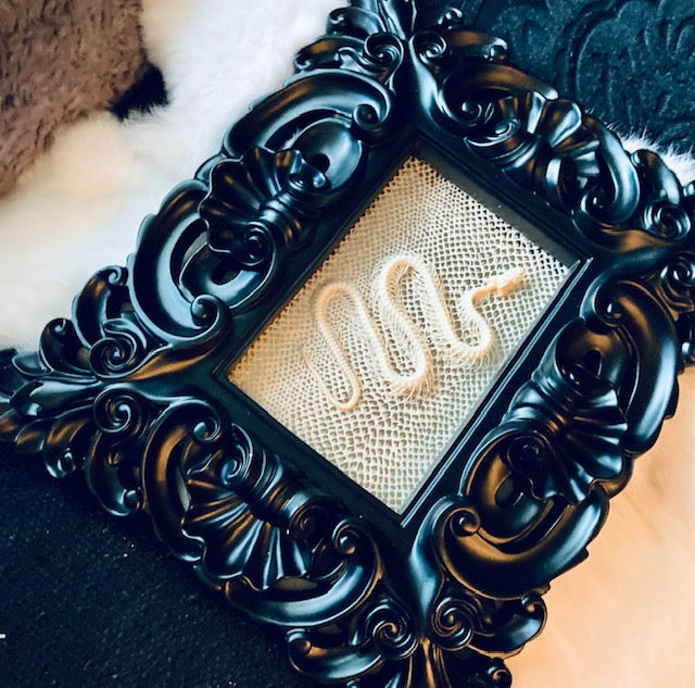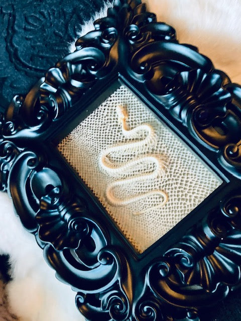 A real Pit Viper Snake Skeleton, fully articulated, mounted in a large, heavy, gothic frame on a faux snake skin fabric background. Frame measures approx. 12"x9" and has hardware attached for easy wall hanging.