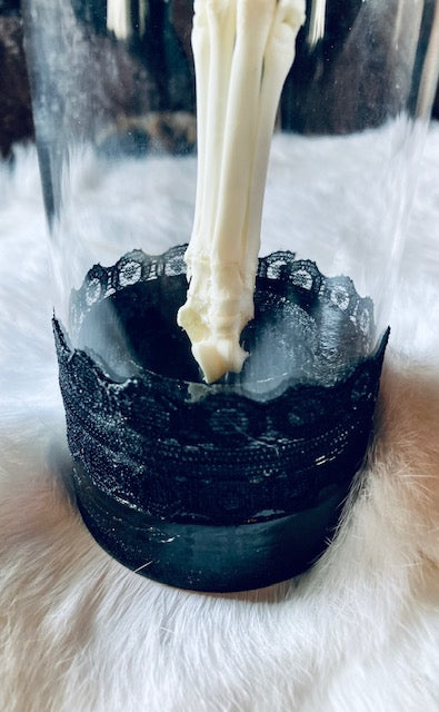 A real, fully articulated rear cat paw mounted in a glass cloche dome. Approx. 5-6" in height. Black Cork bottom and lace embellishments. .