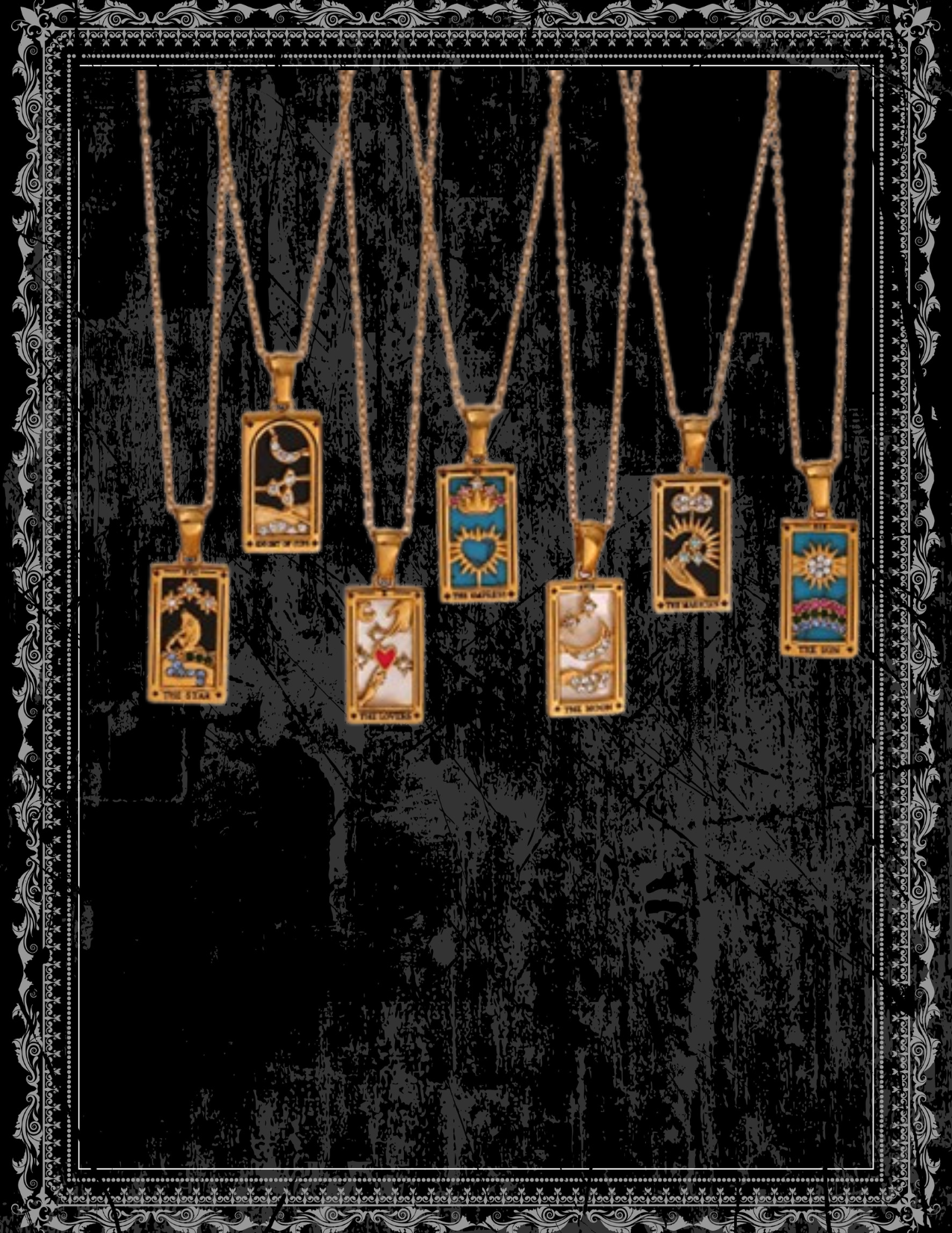 Gorgeous stainless steel and enamel tarot card necklaces. Chains are approx. 18-20" and pendants are approx. 1/2"-1". Chains are stainless steel except the chains on the Carpe Diem and Strength are 18K plated. Colors and size of pendants vary slightly but item received will be very similar to photo.