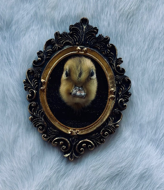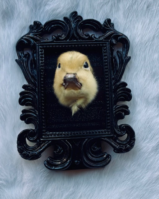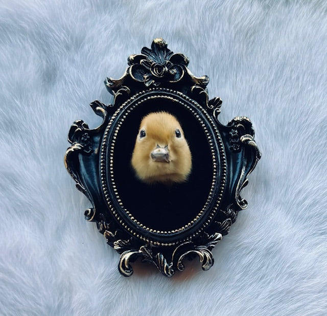 Delicately preserved duckling heads displayed in ornate frames, each design unique in composition and character. These miniature specimens capture the soft fragility and natural beauty of avian form, blending artistry with respectful preservation. Multiple frame and background variations are available, allowing each piece to stand as a distinct work of natural history art. Ethically and responsibly sourced.