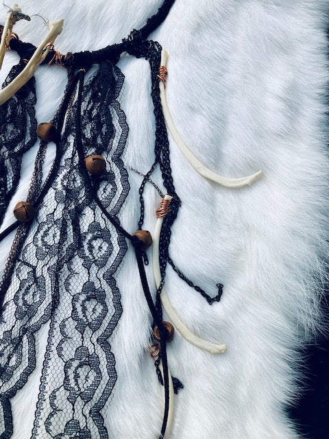 Witch Bells, traditionally are used to keep evil spirits and negative energies from entering the home. They would be hung on the door or windowsill to act as a barrier. This is a 5" ring with antique bells, lace and chain, a real crow's beak, raccoon ribs, rabbit vertebrae and an inverted cross pendant. These measure approx. 22".
