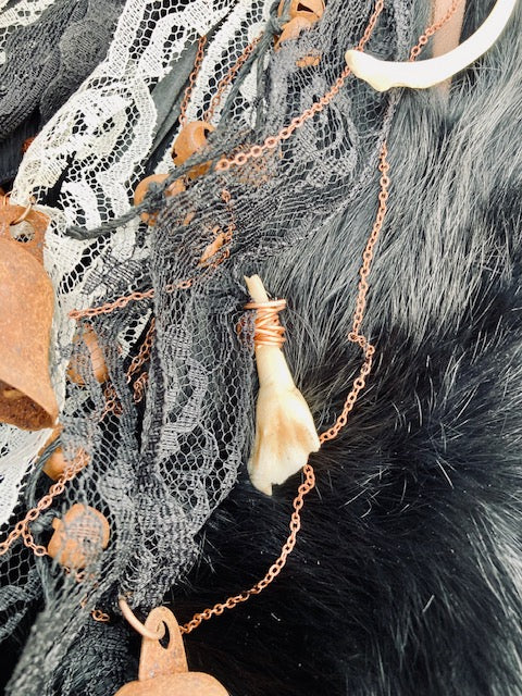 This particular set is a white lace wrapped, 5"diameter metal hoop with large and small antique bells, chains, lace, leather, a genuine black jet gemstone and an electroformed coffin nail with black obsidian. It has real raccoon ribs, a real copper coated mink jaw bone, buffalo tooth and a coyote sacrum bone center piece. Hangs approx. 20-22"
