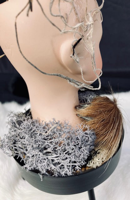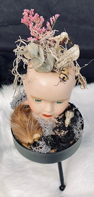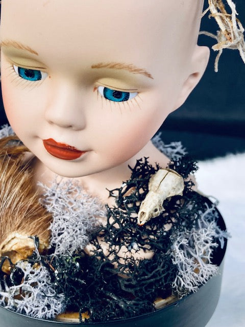 Victorian porcelain doll head in a 10" glass cloche on a black, metal tripod stand. Terrarium has a real skull beetle, a taxidermy porcupine foot, a mole skull, rabbit bones, animal teeth, honeybees, moss and flowers. All real and preserved.